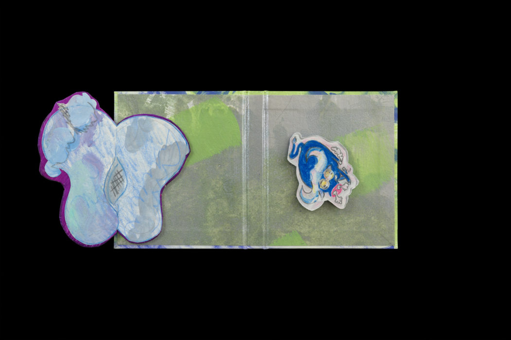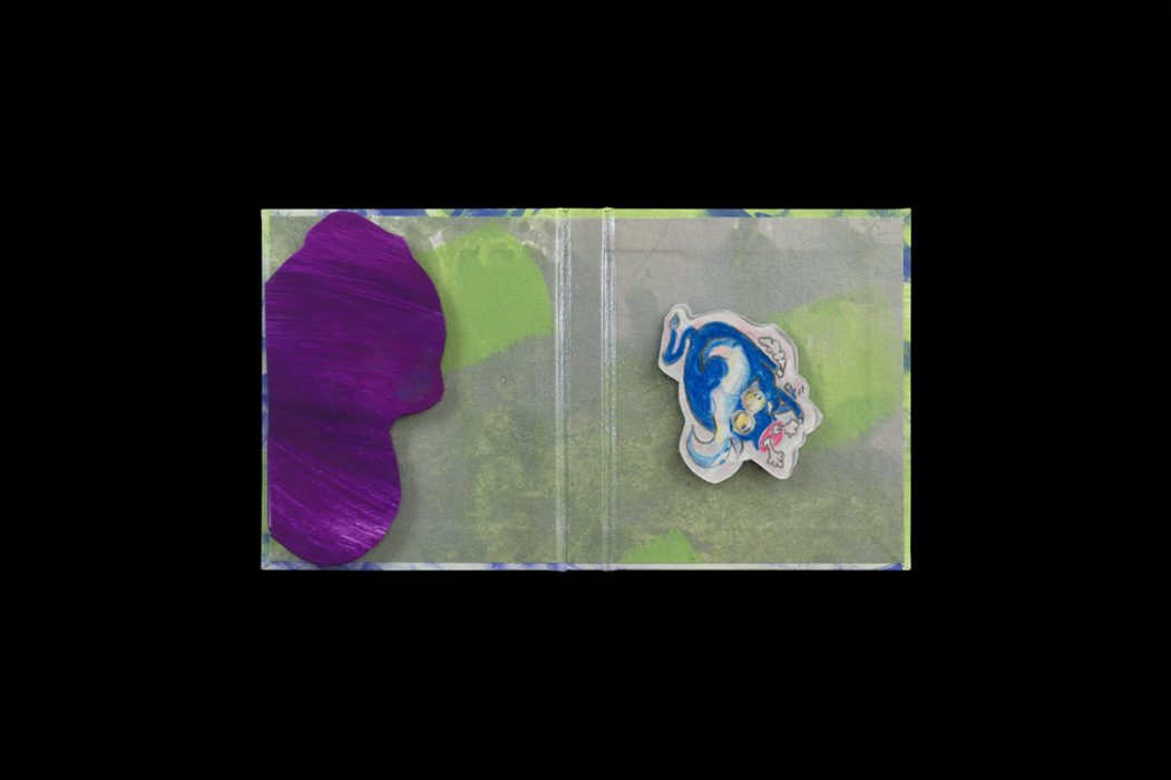 Case binding with Flashe on Shiramine paper with hand- painted and drawn flip-ups in Flashe and colored pencil on Surface Gampi White paper and clay-coated wallpaper, 5.5 x 3.125 x .5 inches