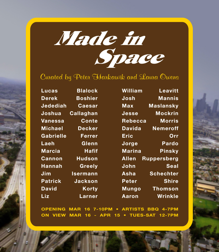 Lucas Blalock, Derek Boshier, Joshua Callaghan, Jedediah Ceasar, Vanessa Conte, Josh Mannis, Michael Decker, Gabrielle Ferrer, Marcia Hafif, Leah Glenn, Cannon Hudson, Hannah Greely, Jim Isermann. Patrick Jackson, David Korty, Liz Larner, William Leavitt, Max Maslansky, Jesse Mockrin, Rebecca Morris, Jorge Pardo, Davida Nemeroff, Eric Orr, Allen Rupersberg, Marina Pinksy, Asha Schechter, Peter Shire, John Seal, Mungo Thompson, Aaron Wrinkle