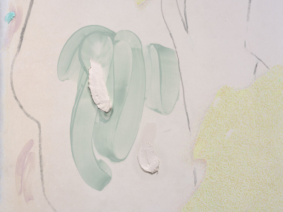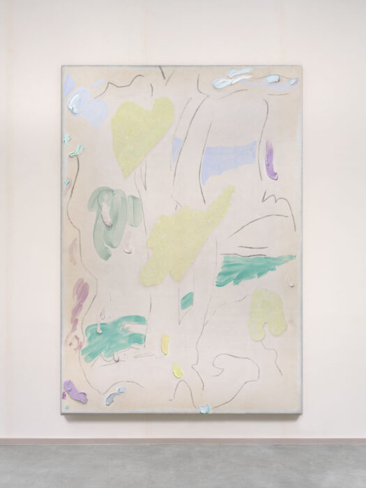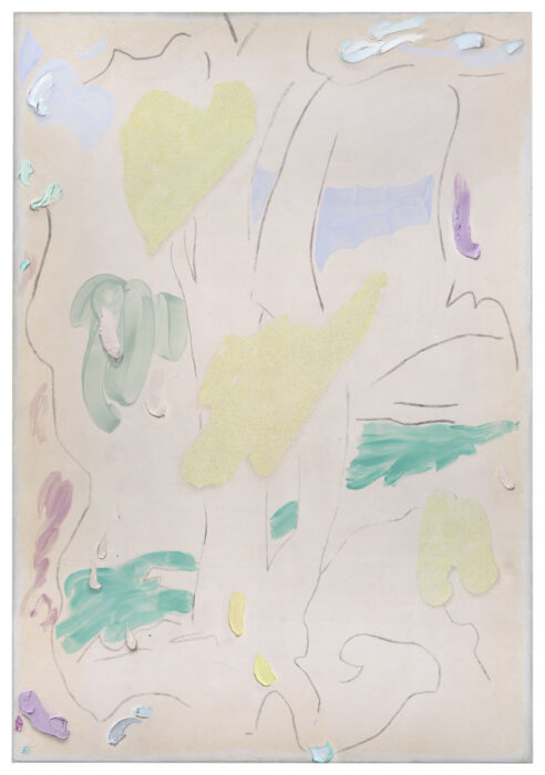 , 2025, Oil, pastel, watercolor, graphite, sand, resin and silkscreened Flashe on linen, 130 x 90 x 1.5 in