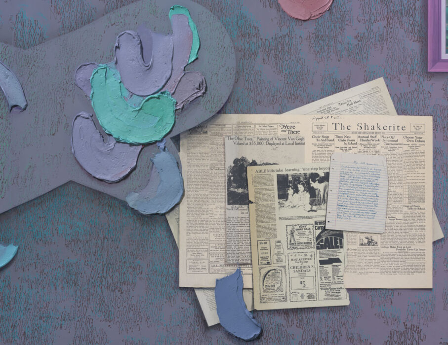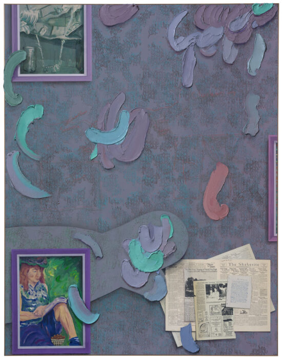 , 2024, Oil, Flashe, screen printing ink and colored sand on clay-coated wallpaper mounted to aluminum, wood frame, 108.5 x 84.5 x 1.5 in
