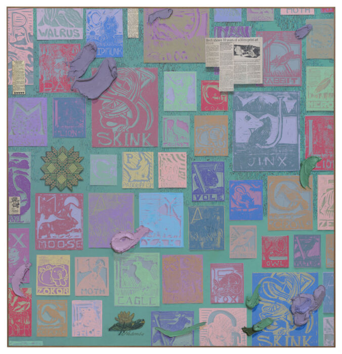 , 2025, Oil, Flashe and screen printing ink on clay-coated wallpaper mounted to aluminum, walnut frame, 56.625 x 54.5 x 1.5 in