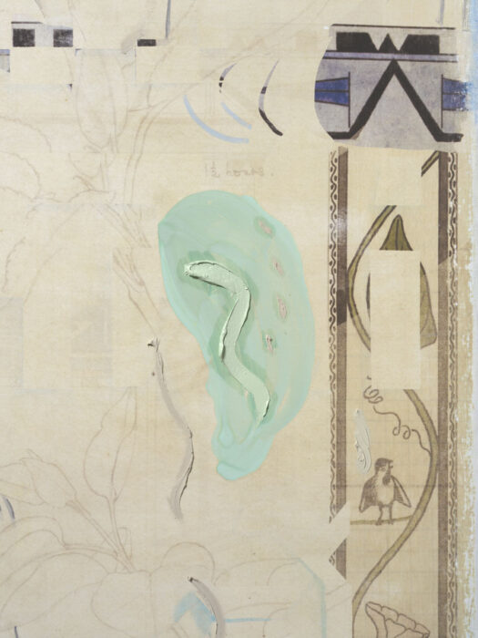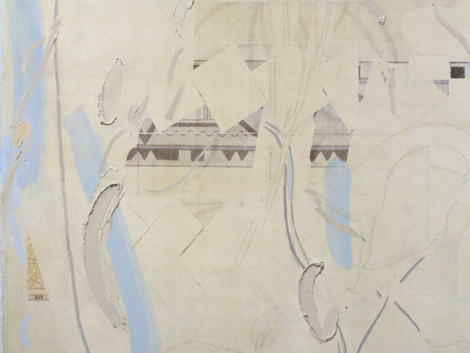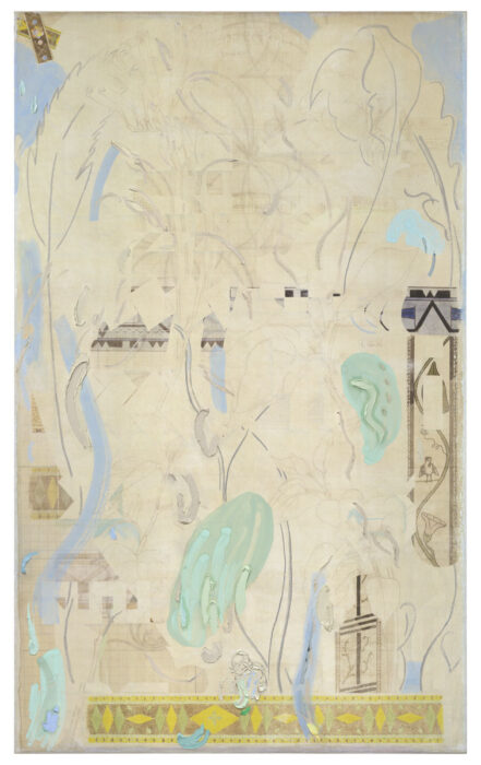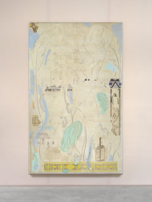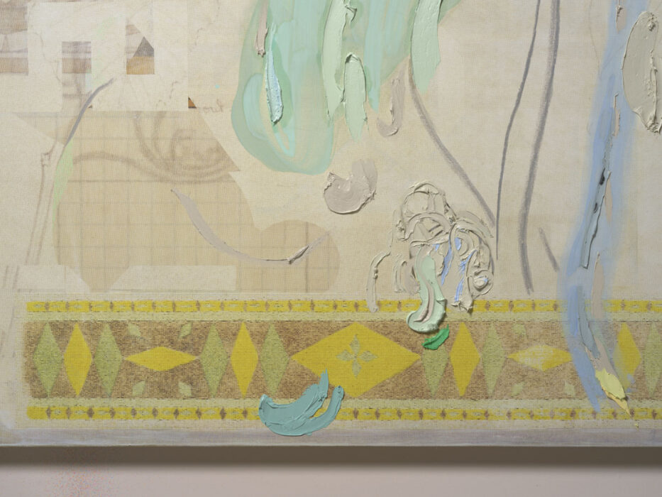, 2025, Oil, pastel, charcoal and silkscreened ink on linen, 130 x 80 x 1.5 in